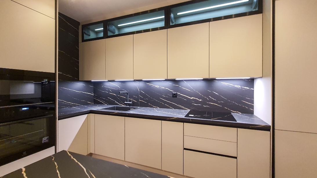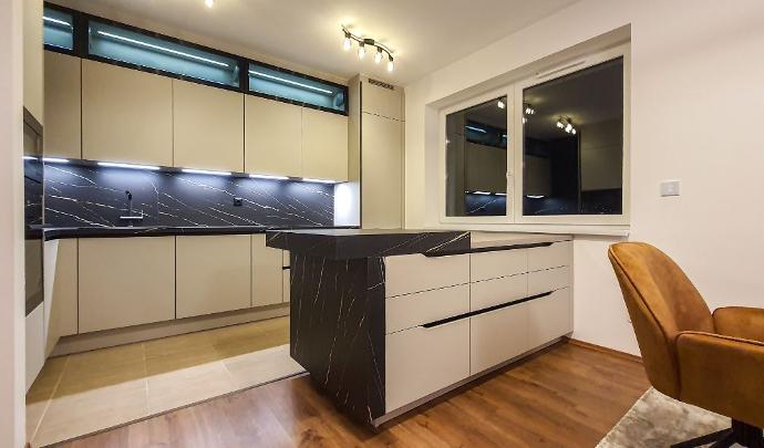 A konyha tervezésénél az egyik legfontosabb szempont az volt, hogy az ügyfél barátokat, családot, akár nagyobb társaságot is kényelmesen tudjon fogadni. A lakás méretéhez képest egy meglepően tágas, jól működő közösségi tér kialakítása volt a cél.