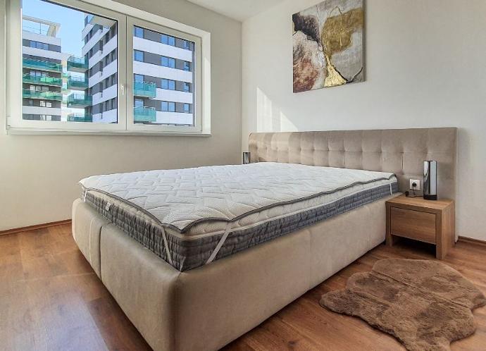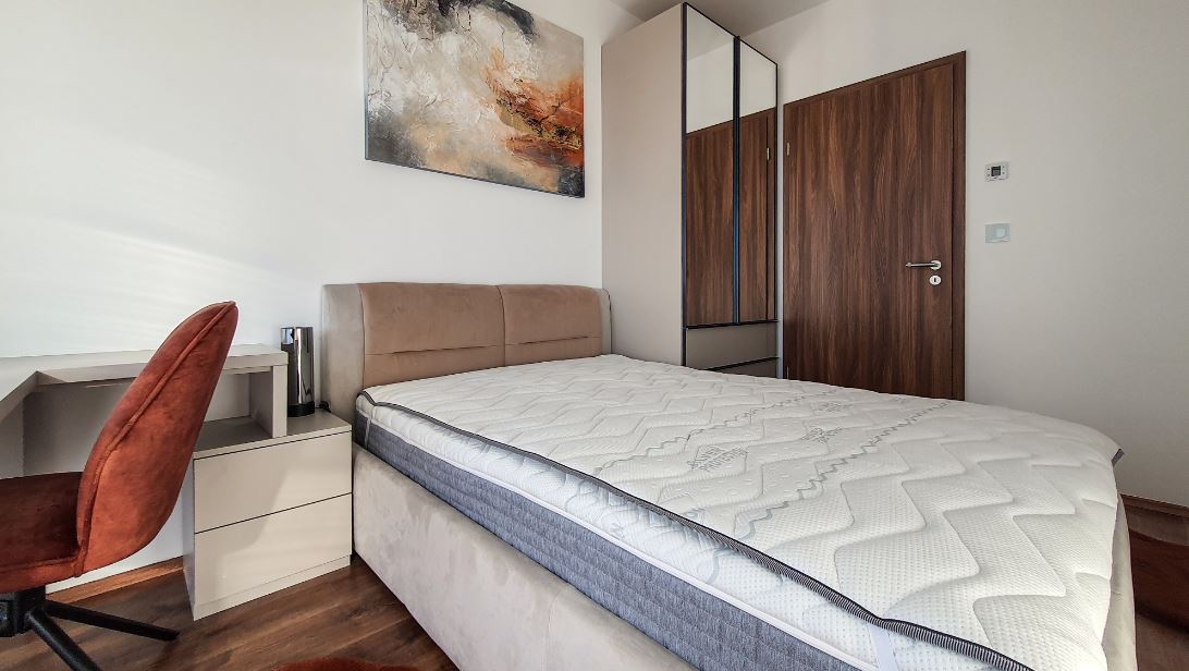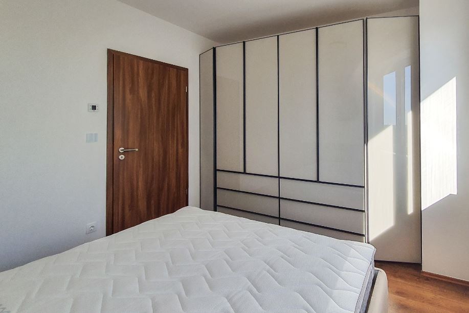A hálószobában a letisztultság és a funkcionalitás dominál. Az egyik legfontosabb igény a tárolókapacitás maximalizálása volt. Ennek megfelelően a gardrób tervezésekor minden egyes négyzetcentimétert kihasználtunk. A gardrób mellett egy egyedi kárpitozott ágy is bekerült a szobába, ágyneműtartóval, amely további pakolófelületet biztosít.