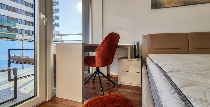A íróasztalt és a hozzá tartozó tárolót, ami egyben éjjeliként is funkcionál úgy terveztük meg, hogy a munkaállomás könnyed, letisztult és inspiráló legyen, miközben a kilátás végig érvényesül. Ez az a pont, ahol a tér adottságai valóban hozzáadnak a mindennapi életminőséghez.