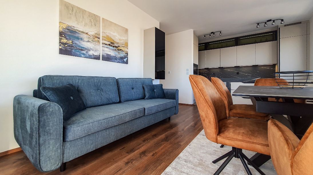A nappali–étkező térben a bútorok nem uralják a helyiséget, hanem finoman keretezik az életteret. A tervezésénél különösen fontos volt, hogy a tér vendégek fogadására és alkalmi – sőt akár mindennapi – alvásra is alkalmas legyen. Ezért esett a választás a Sinki kanapéra, amely teljes egészében zsákrugós ülő- és fekvőfelülettel rendelkezik, miközben megjelenésében nem robosztus, hanem modern és könnyed. A kerámia felületű, bővíthető Heaven étkezőasztal a hosszú és időtálló megoldásért, az Otto étkezőszékek pedig a lehető legnagyobb kényelmet szolgálják, hogy az itt töltött idő valóban minőségi legyen – akár vendégfogadásról, akár egy nyugodt estéről van szó.