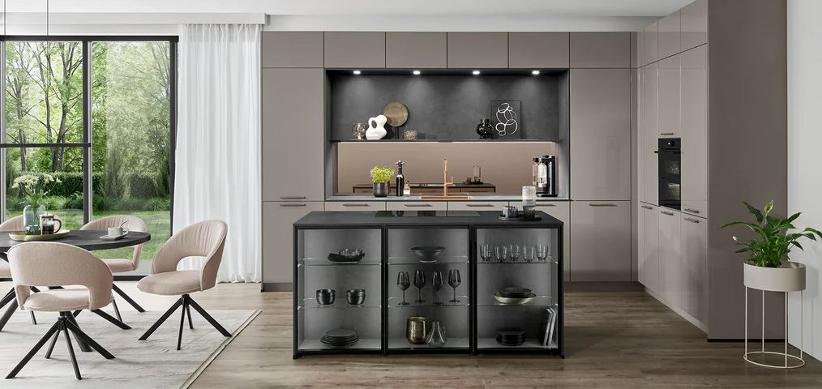 A valódi lakkozott frontok magasfényű kivitele továbbra is trendi, és most már a népszerű taupe szürke árnyalatban is elérhető. A meleg szürkés tónus enyhe barna felhanggal nyugodt, modern hangulatot teremt, ami eleganciát és harmóniát sugároz a térben.